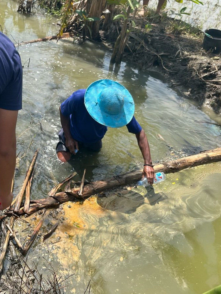 Petugas Sat Reskrim Polres Bojonegoro saat mengambil sampel air dugaan pencemaran limbah dari pengeboran minyak Pertamina EP Sukowati, Bojonegoro. Minggu (16/02/2025) (Aset: Istimewa)