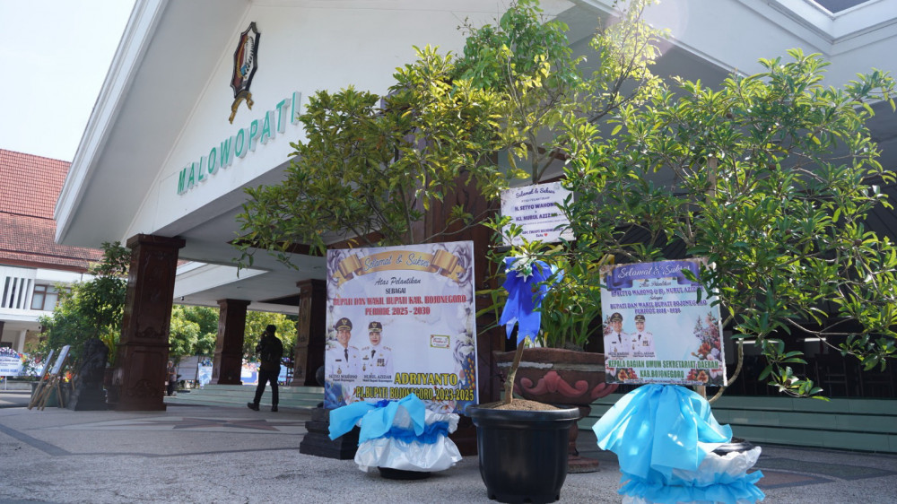 Sejumlah ucapan selamat dalam bentuk pohon hidup untuk Bupati dan Wakil Bupati Bojonegoro Setyo Wahono-Nurul Azizah. Jumat (21/02/2025) (Aset: Istimewa.