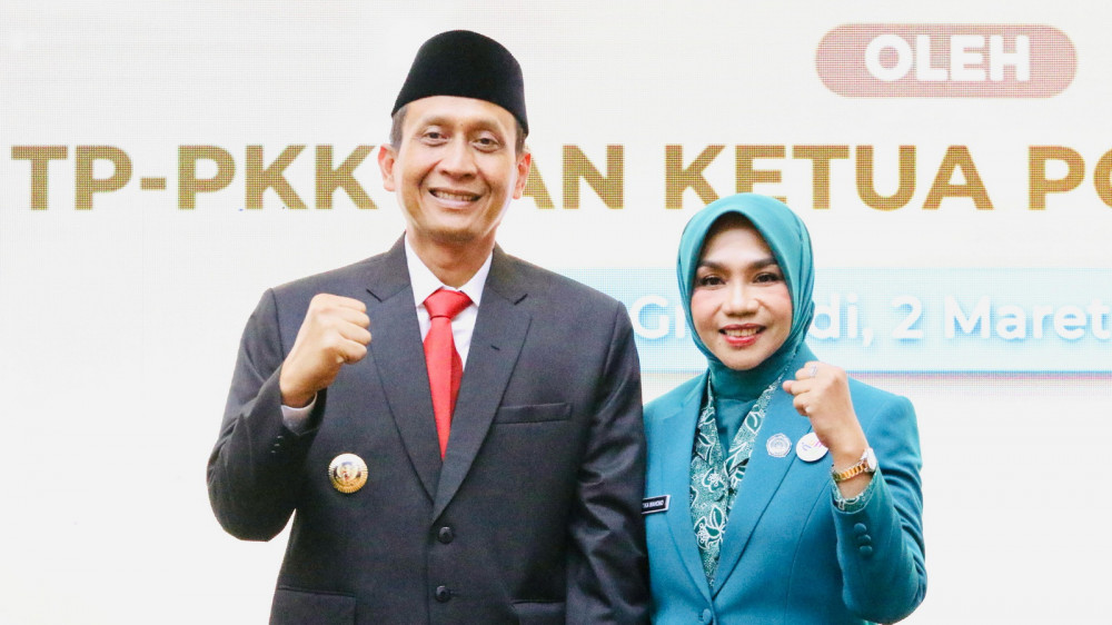 Bupati Bojonegoro Setyo Wahono bersama istri, Dr H Sri Budi Cantika Yuli saat foto bersama usai dilantik sebagai Ketua Tim Penggerak PKK dan Ketua Pembina Posyandu Kabupaten Bojonegoro. (Aset: Istimewa)