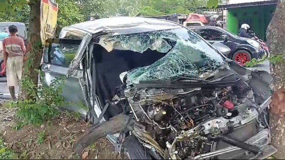 Diduga pengemudi Daihatsu Xenia mengantuk sehingga kendaraannya oleng ke kanan dan bertabrakan dengan truk Mitsubishi bermuatan buah-buahan.