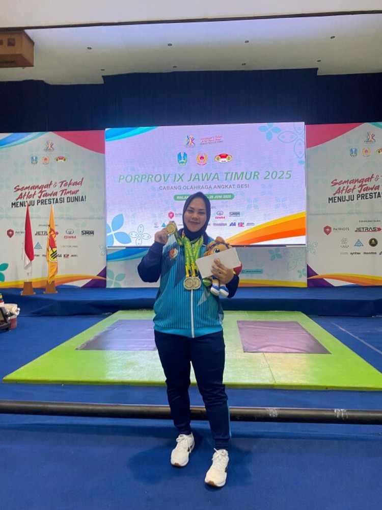 Atlet Angkat Besi Bojonegoro, Pretty Yuvita Kartika Sari, saat usai terima medali emas dalam Porprov IX Jatim 2025, di Sasana Krida Kota Malang. Kamis (26/06/2025) (Aset: Istimewa)
