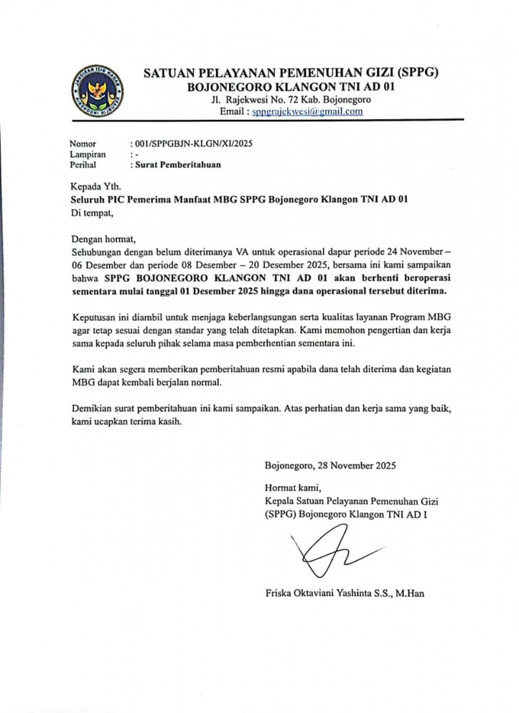 Dalam surat edaran tertanggal 28 November 2025 yang ditandatangani Kepala SPPG Bojonegoro Klangon TNI AD I, Friska Oktaviani Yashinta menyatakan langkah ini dilakukan demi menjaga kualitas layanan.
