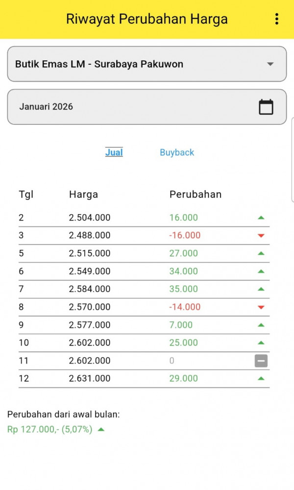 Tangkapan layar riwayat perubahan harga emas batangan di Butik Emas LM ANTAM Surabaya Pakuwon, Surabaya. Senin (12/01/2026)
