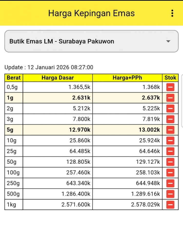 Tangkapan layar harga kepingan emas batangan di Butik Emas LM ANTAM Surabaya Pakuwon, Surabaya. Senin (12/01/2026)