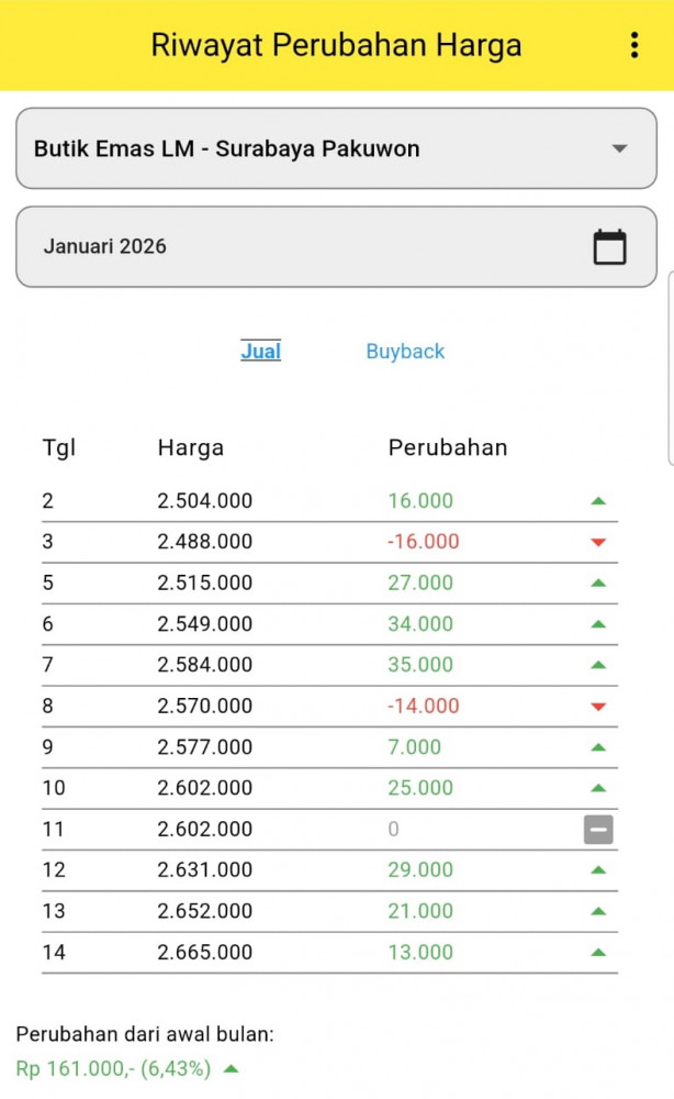 Tangkapan layar riwayat perubahan harga emas batangan di Butik Emas LM ANTAM Surabaya Pakuwon, Surabaya. Rabu (14/01/2026).