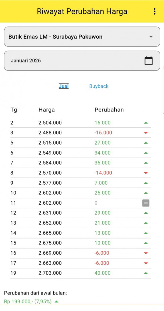 Tangkapan layar riwayat perubahan harga emas batangan di Butik Emas LM ANTAM Surabaya Pakuwon, Surabaya. Senin (19/01/2026).