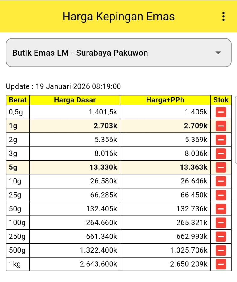 Berikut rincian harga emas batangan di Butik Emas LM ANTAM Surabaya Pakuwon, Surabaya hari ini, update 19 Januari 2026 pukul 08.19 WIB: