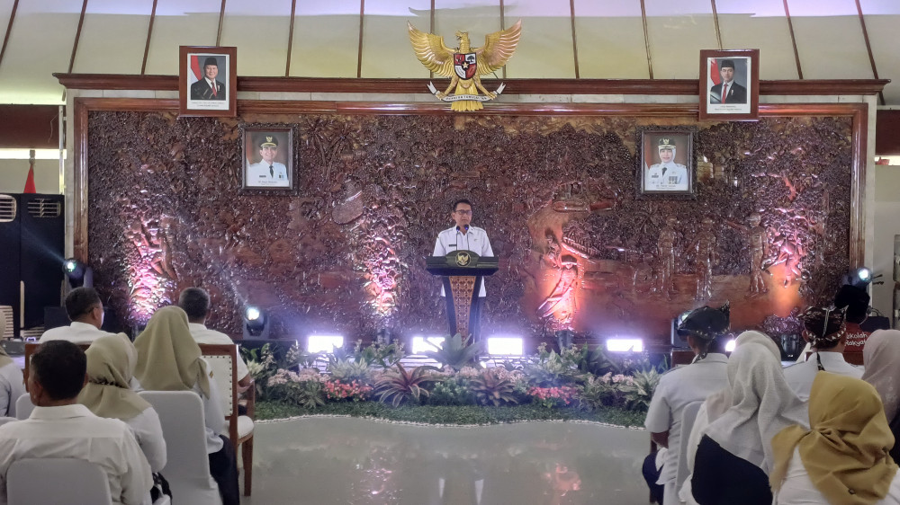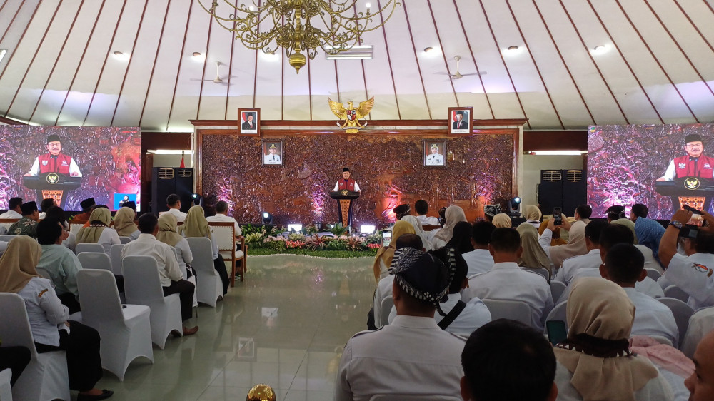 Bupati Bojonegoro Setyo Wahono, saat beri sambutan dalam acara sosialisasi DTSEN di Pendopo Pemkab Bojonegoro. Rabu (21/01/2026). (Aset: beritabojonegoro/imam nurcahyo)