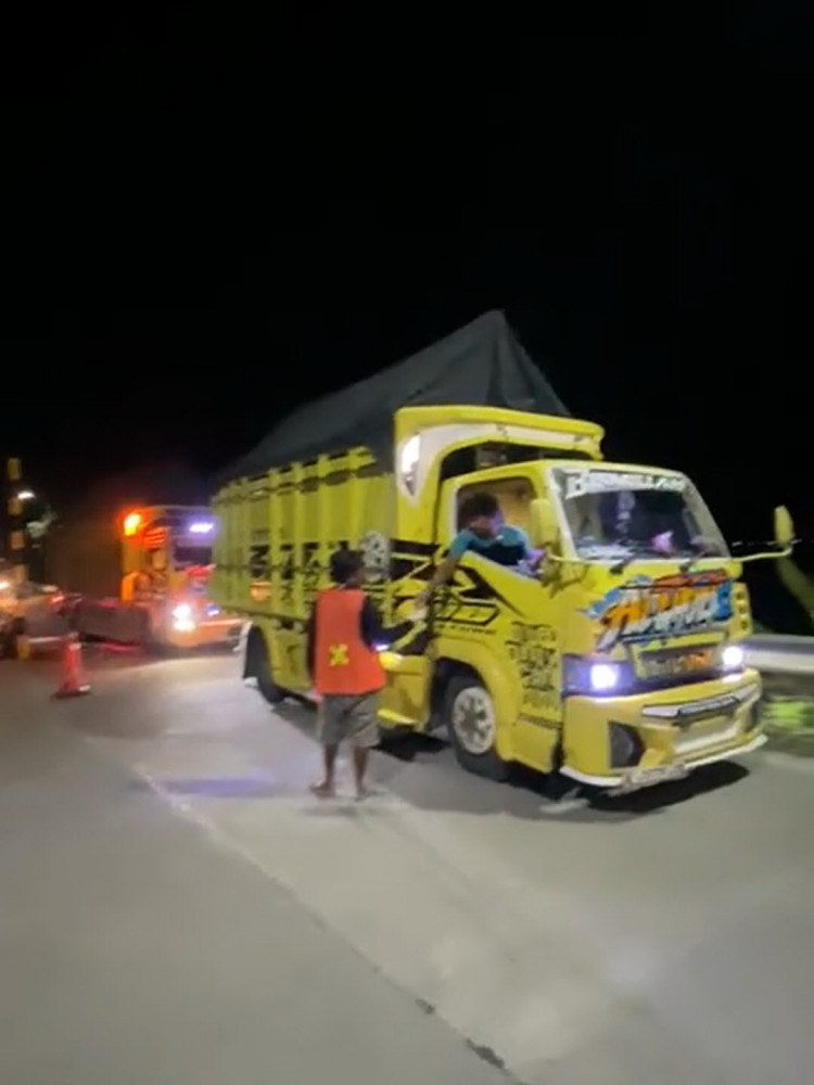 Dan setelah truk berhasil melintas, tampak warga mengenakan rompi oranye tersebut menunggu atau menerima sesuatu, yang duduga uang, dari sopir truk yang hendak melintas tersebut.