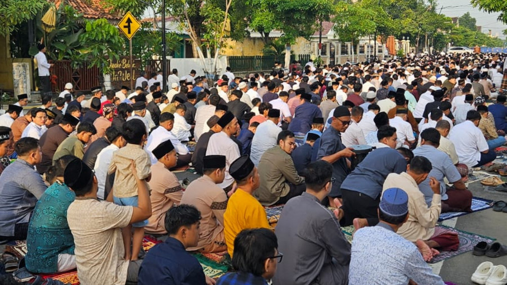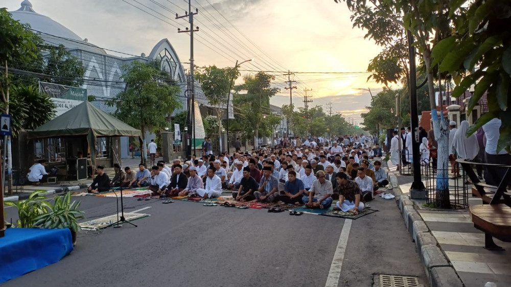 Salat Idulfitri 1447 Hijriah di Jalan Teuku Umar depan Masjid At-Taqwa Kota Bojonegoro. Jumat (20/03/2026) (Aset: beritabojonegoro/imam nurcahyo)