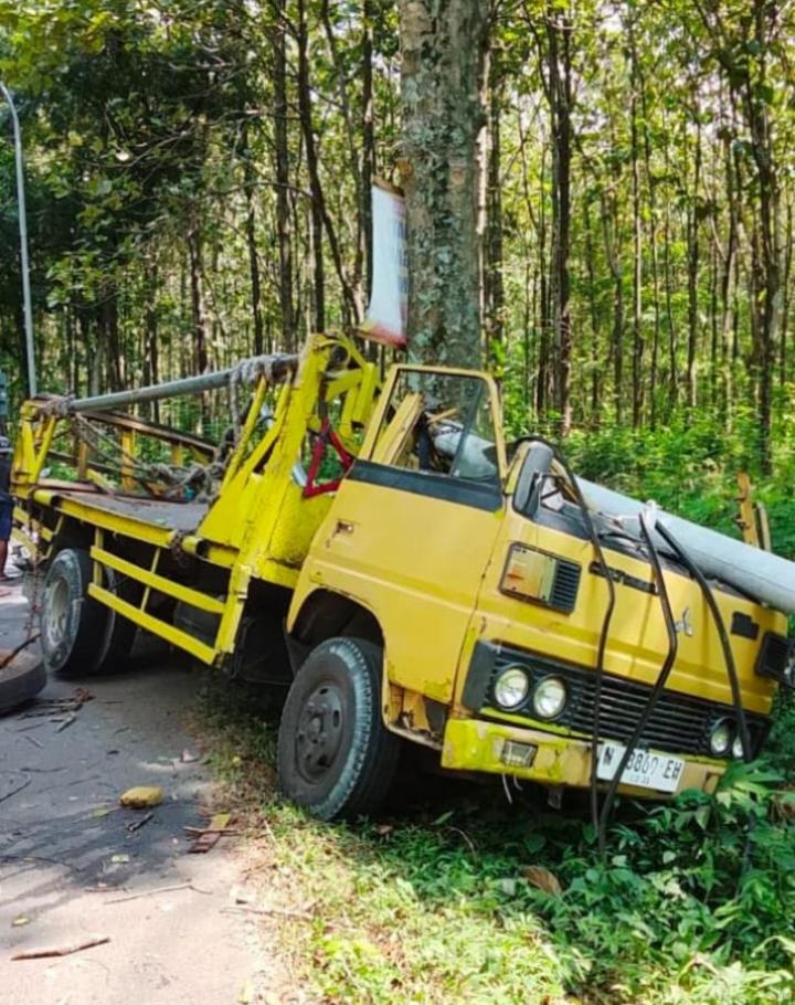 Truk bermuatan tiang lampu penerangan jalan umum (PJU) tiba tiba oleng sehingga menabrak pohon yang berada di pinggir jalan. Akibatnya, pengemudi truk mengalami luka ringan.