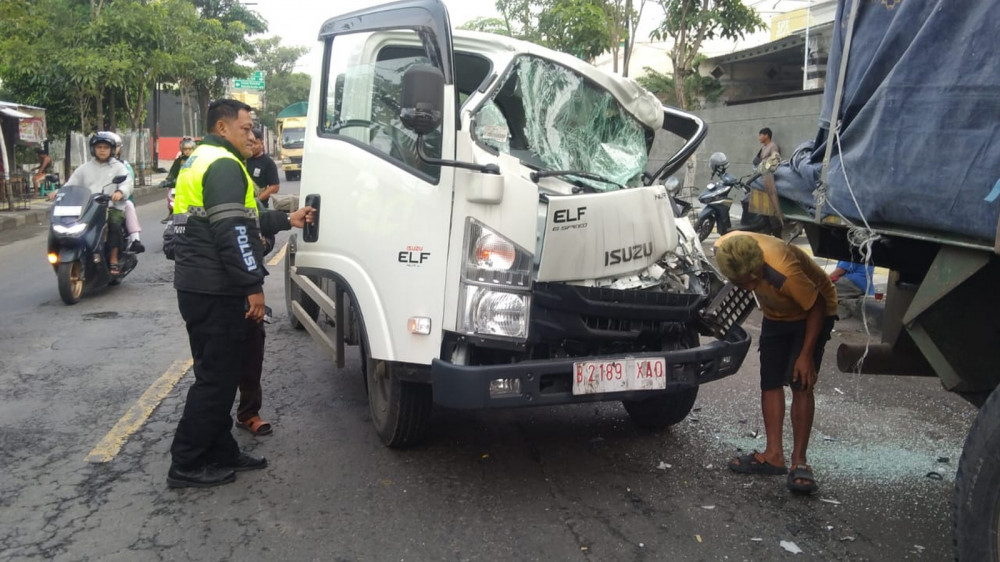 Diduga pengemudi truk Isuzu Elf profit mengantuk sehingga kendaraan yang dikemudikannya oleng ke kiri dan menabrak truk trailer yang sedang parkir di pinffir jalan.