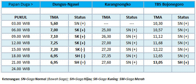 Kota - Sehubungan telah terjadi hujan ekstrim di wilayah Kabupaten Ngawi dan sekitarnya, pada Rabu (24/02), sejak pukul 21.00 WIB malam ini, status Tinggi Muka Air (TMA) pada papan duga TBS Bojonegoro Kota telah menyentuh angka 13,05 mdpl atau telah memasuki status siaga hijau.