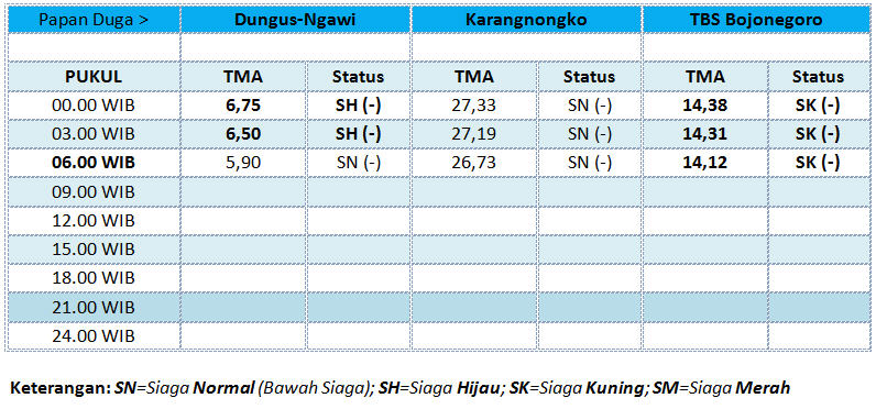 Hingga pukul 06.00 WIB pada Jum'at (26/02) pagi ini, Tinggi Muka Air (TMA) Bengawan Solo pada papan duga TBS Bojonegoro Kota menunjuk pada angka 14,12 mdpl atau masih pada status siaga kuning, namun seiring dengan tren yang terus menunjukkan penurunan tersebut, status siaga kuning ini dalam beberapa jam ke depan diperkirakan akan segera turun menjadi siaga hijau.