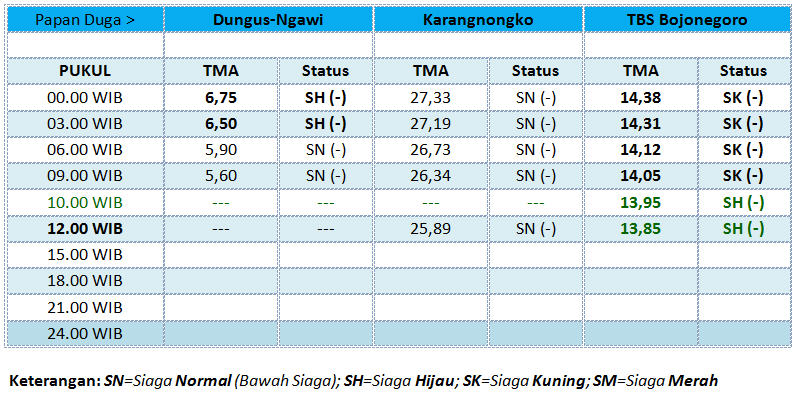 Berikut ini update status TMA Bengawan Solo, yang diterima BBC (BeritaBojonegoro.com) dari UPT Pengelola Sumber Daya Air (UPT PSDA) Wilayah Sungai Bengawan Solo untuk tanggal 26 Februari 2016, hingga pukul 12.00 WIB. (lyn/ inc)