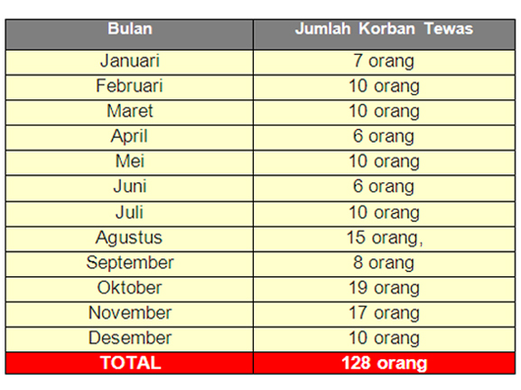 Korban kecelakaan paling banyak pada bulan Oktober , yakni 75 kejadian yang melibatkan 153 korban. Korban yang meninggal mencapai 19 orang, dan 3 orang luka berat dan 131 luka ringan.