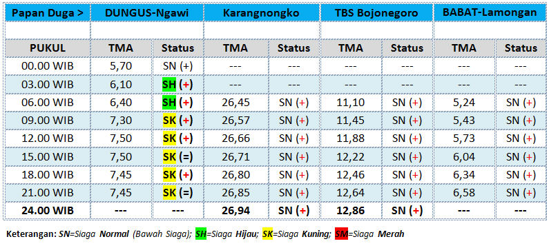 Kepala Pelaksana Badan Penanggulangan Bencana Daerah (BPBD) Kabupaten Bojonegoro, Andhik Sujarwo, kepada BBC (BeritaBojonegoro.com) menjelaskan, bahwa perkiraan tersebut didasarkan pada tinggi muka air pada papan duga Dungus Ngawi sejak pukul 09.00 WIB pagi hari tadi telah memasuki status siaga kuning dan bertahan hingga pukul 24.00 WIB malam ini.