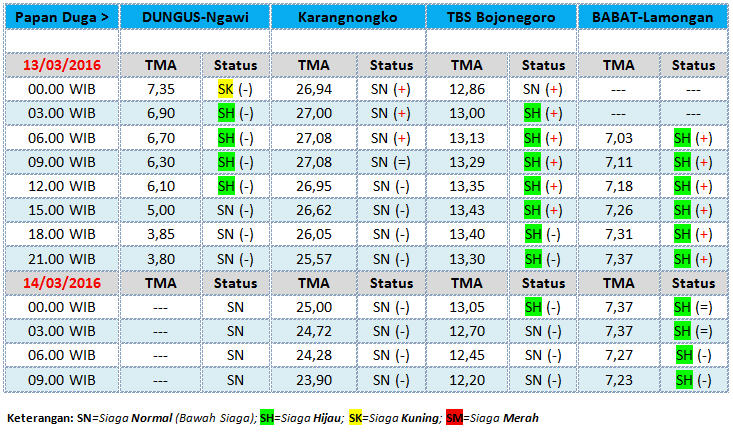 Berikut ini update status TMA Bengawan Solo, yang diterima BBC (BeritaBojonegoro.com) dari UPT Pengelola Sumber Daya Air (UPT PSDA) Wilayah Sungai Bengawan Solo untuk tanggal 14 Maret 2016, hingga pukul 09.00 WIB. (lyn/ inc).