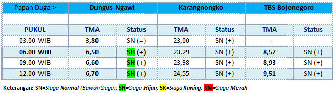 Saat ini TMA pada papan duga Taman Bengawan Solo (Kota) menunjukkan posisi kisaran 8 MDPL. Kondisi ini diperkirakan akan terus naik dan diperkirakan akan sampai pada level siaga hijau, mengingat prakiraan BMKG menyebutkan curah hujan yang sangat deras masih akan terjadi di wilayah Jawa Tengah dan Jawa Timur selama 3 hari kedepan.