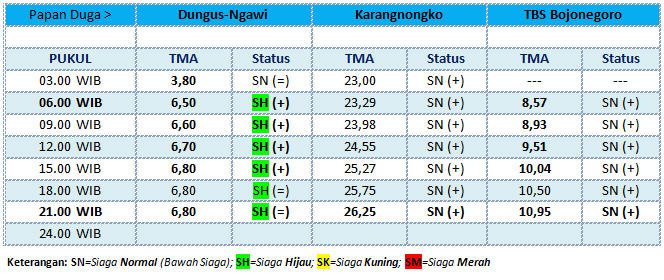 Berikut ini update status TMA Bengawan Solo, yang diterima BBC (BeritaBojonegoro.com) dari UPT Pengelola Sumber Daya Air (UPT PSDA) Wilayah Sungai Bengawan Solo untuk tanggal 19 Juni 2016, hingga pukul 21.00 WIB. (her/ inc)