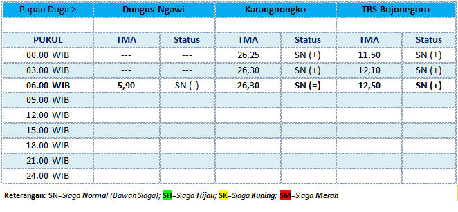 Dan berdasarkan update data TMA Bengawan Solo sepanjang 24 jam kemarin, diperkirakan pada Senin sore hingga malam nanti, TMA Bengawan Solo pada papan duga TBS Bojonegoro Kota diprediksi akan masuk pada status siaga hijau.