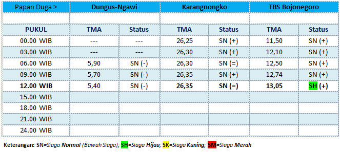 Kota - Seperti yang telah diperkirakan sebelumnya, bahwa pada Senin (20/06) Tinggi Muka Air Bengawan Solo di wilayah Kabupaten Bojonegoro diprediksi akan masuk pada status siaga hijau. Dan pada pukul 12.00 WIB siang ini, status Tinggi Muka Air Bengawan Solo pada papan duga TBS Bojonegoro Kota, masuk pada status siaga hijau.