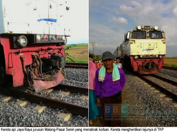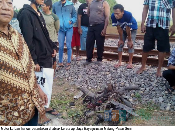 Menurut keterangan Kepolisian, korban sedang melaju dari arah selatan ke utara dengan mengendarai sepeda motor yang mengangkut satu karung padi. Tepat ketika melintasi rel dari arah barat melaju kereta api Jaya Baya jurusan Malang-Jaya Baya. Korban tertabrak dan terseret sejauh seratus meter. Korban meninggal dunia di tempat kejadian. Saat ini petugas sedang melakukan proses identifikasi di lokasi kejadian.