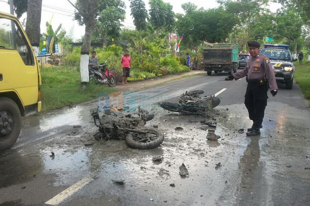 "Akibatnya kedua sepeda motor terbakar. Sedangkan korban Maslukhan mengalami patah tulang tangan kanan dan Rohmad mengalami patah tulang selangka," terang Kapolsek Dander AKP Sunarmin.