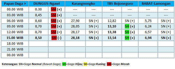 Kasi Pencegahan dan Kesiapsiagaan Badan Penanggulangan Bencana Daerah (BPBD) Kabupaten Bojonegoro, Sukirno, kepada awak media meneranggkan bahwa sejak Rabu (28/09/2016) kemarin, wilayah hulu Bengawan Solo (Dungus Ngawi) mengalami kenaikan cepat sampai dengan level siaga merah. Hal ini disebabkan curah hujan yg sangat deras di wilayah Ponorogo, Madiun dan Ngawi.