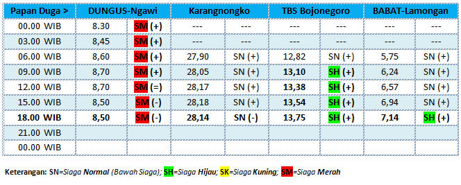 Berikut ini update status TMA Bengawan Solo, yang diterima BBC (BeritaBojonegoro.com) dari UPT Pengelola Sumber Daya Air (UPT PSDA) Wilayah Sungai Bengawan Solo untuk tanggal 29 September 2016, hingga pukul 18.00 WIB. (ver/inc)