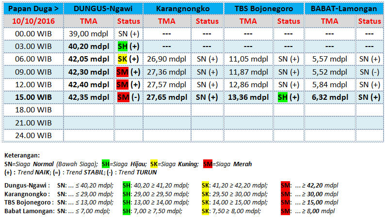 Berikut ini update status TMA Bengawan Solo, yang diterima BBC (BeritaBojonegoro.com) dari UPT Pengelola Sumber Daya Air (UPT PSDA) Wilayah Sungai Bengawan Solo untuk tanggal 10 Oktober 2016, hingga pukul 15.00 WIB. (her/inc)