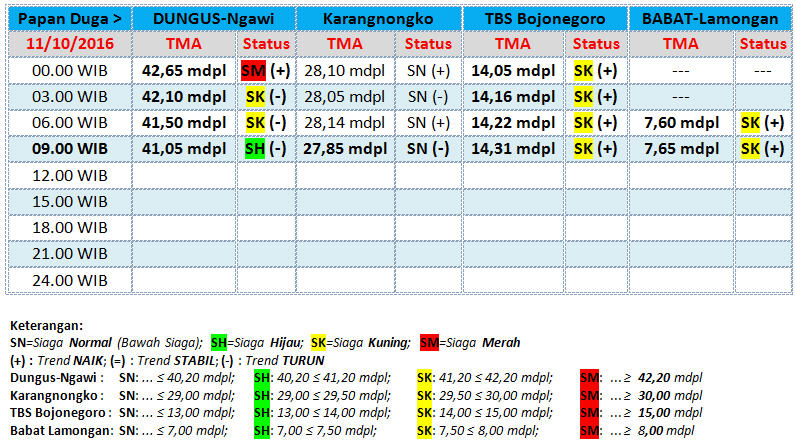 Berikut ini update status TMA Bengawan Solo, yang diterima BBC (BeritaBojonegoro.com) dari UPT Pengelola Sumber Daya Air (UPT PSDA) Wilayah Sungai Bengawan Solo, hari Selasa (11/10/2016) pukul 09.00 WIB. (*/inc)