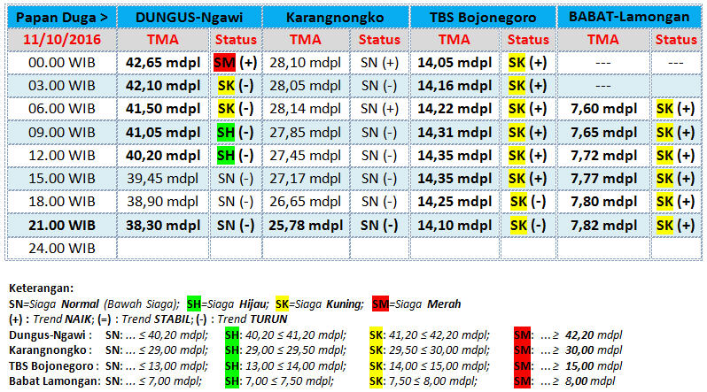 Berikut ini update status TMA Bengawan Solo, yang diterima BBC (BeritaBojonegoro.com) dari UPT Pengelola Sumber Daya Air (UPT PSDA) Wilayah Sungai Bengawan Solo, hari Selasa (11/10/2016) pukul 21.00 WIB. (*/inc)