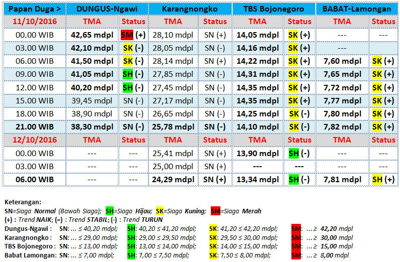 Berikut ini update status TMA Bengawan Solo, yang diterima BBC (BeritaBojonegoro.com) dari UPT Pengelola Sumber Daya Air (UPT PSDA) Wilayah Sungai Bengawan Solo, hari Selasa (12/10/2016) pukul 06 .00 WIB. (*/inc)