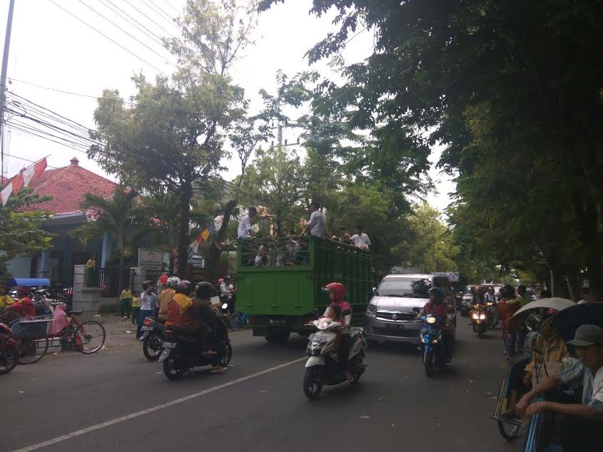Dalam foto tersebut, terlihat para santri peserta upacara berdesak - desakan di atas kendaraan truk. Foto diambil kamera beritabojonegoro.com (BBC), saat mereka dalam perjalanan pulang di Jalan Teuku Umar Bojonegoro Kota. Mereka menampakkan wajah yang gembira, meskipun itu hal yang berbahaya. Menurut peraturan yang ada kendaraan truk terbuka sebenarnya bukan untuk mengangkut manusia. Yang lebih penting dari itu sebenarnya adalah keamanan mereka. Mereka bisa saja terjatuh dan terluka.(pin/moha)