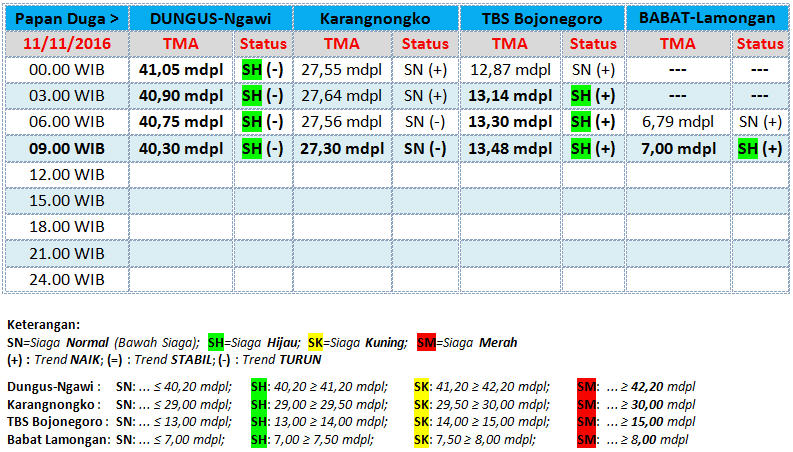 Berikut ini update status TMA Bengawan Solo, yang diterima BBC (BeritaBojonegoro.com) dari UPT Pengelola Sumber Daya Air (UPT PSDA) Wilayah Sungai Bengawan Solo untuk tanggal 11 November 2016, hingga pukul 09.00 WIB. (*/inc)
