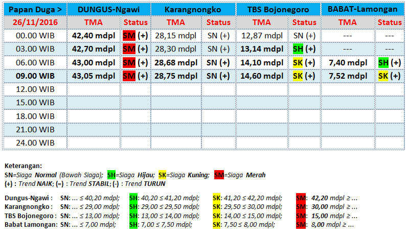 Bojonegoro Kota - Berikut ini update status Tinggi Muka Air (TMA) Bengawan Solo, yang diterima BBC (BeritaBojonegoro.com) dari UPT Pengelola Sumber Daya Air (UPT PSDA) Wilayah Sungai Bengawan Solo untuk tanggal 26 November 2016, hingga pukul 09.00 WIB. (*/inc)