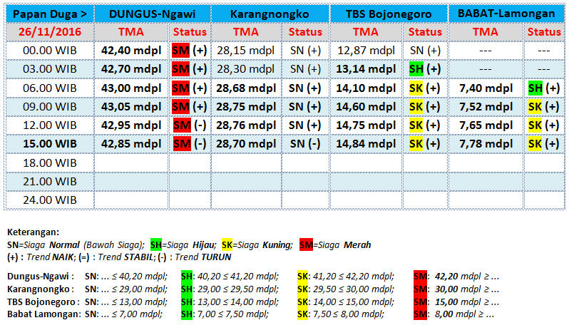 Berikut ini update status Tinggi Muka Air (TMA) Bengawan Solo, yang diterima BBC (BeritaBojonegoro.com) dari UPT Pengelola Sumber Daya Air (UPT PSDA) Wilayah Sungai Bengawan Solo untuk tanggal 26 November 2016, hingga pukul 15.00 WIB. (*/inc)