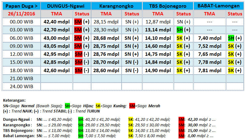 Berikut ini update status Tinggi Muka Air (TMA) Bengawan Solo, yang diterima BBC (BeritaBojonegoro.com) dari UPT Pengelola Sumber Daya Air (UPT PSDA) Wilayah Sungai Bengawan Solo untuk tanggal 26 November 2016, hingga pukul 18.00 WIB. (*/inc)