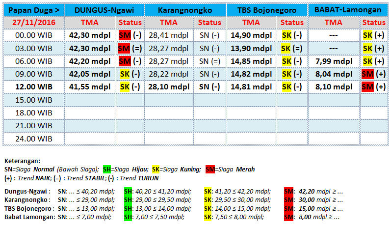 Berikut ini update status Tinggi Muka Air (TMA) Bengawan Solo, yang diterima BBC (BeritaBojonegoro.com) dari UPT Pengelola Sumber Daya Air (UPT PSDA) Wilayah Sungai Bengawan Solo untuk tanggal 27 November 2016, hingga pukul 12.00 WIB. (*/inc)