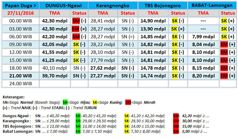 Berikut ini update status Tinggi Muka Air (TMA) Bengawan Solo, yang diterima BBC (BeritaBojonegoro.com) dari UPT Pengelola Sumber Daya Air (UPT PSDA) Wilayah Sungai Bengawan Solo untuk tanggal 27 November 2016, hingga pukul 21.00 WIB. (*/inc)