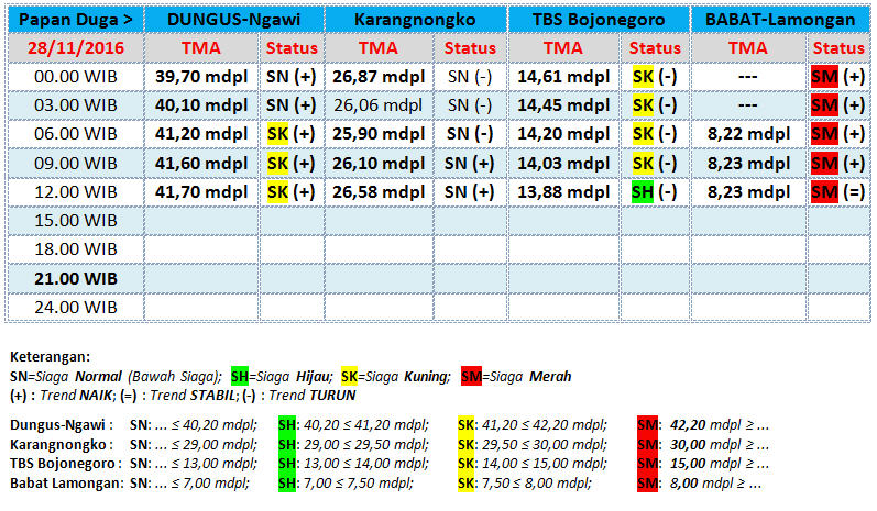 Berikut ini update status Tinggi Muka Air (TMA) Bengawan Solo, yang diterima BBC (BeritaBojonegoro.com) dari UPT Pengelola Sumber Daya Air (UPT PSDA) Wilayah Sungai Bengawan Solo untuk tanggal 28 November 2016, hingga pukul 12.00 WIB. (*/inc)