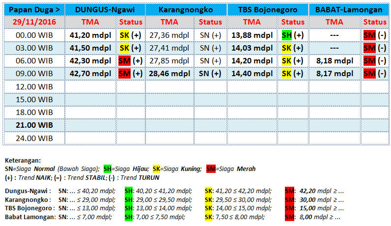 Berdasarkan pantauan UPT Pengelola Sumber Daya Air (UPT PSDA) Wilayah Sungai Bengawan Solo, sejak pukul 03.00 WIB pada Selasa (29/11/2016) dini hari tadi, Tinggi Muka Air (TMA) Bengawan Solo pada papan duga Taman Bengawan Solo (TBS) Bojonegoro Kota, statusnya meningkat dari siaga hijau menjadi siaga kuning.
