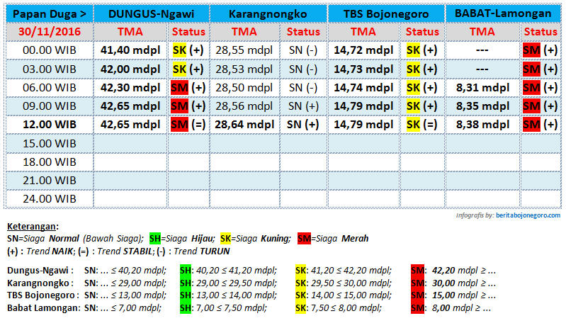 Berikut ini update status Tinggi Muka Air (TMA) Bengawan Solo, yang diterima BeritaBojonegoro.com dari UPT Pengelola Sumber Daya Air (UPT PSDA) Wilayah Sungai Bengawan Solo untuk tanggal 30 November 2016, hingga pukul 12.00 WIB. (*/inc)