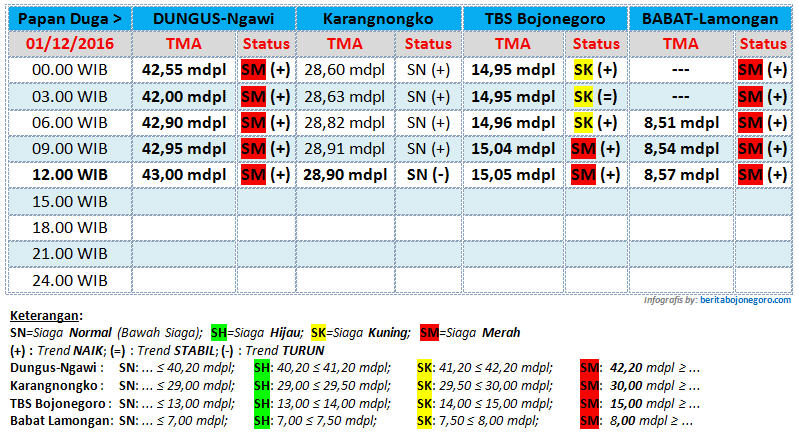 Sebagaimana diberitakan sebelumnya, pada pukul 08.00 WIB, Kamis (01/12/2016) pagi ini, Bojonegoro Kota masuk dalam status siaga merah dan diperkirakan status siaga merah tersebut akan bertahan hingga beberapa jam mendatang.