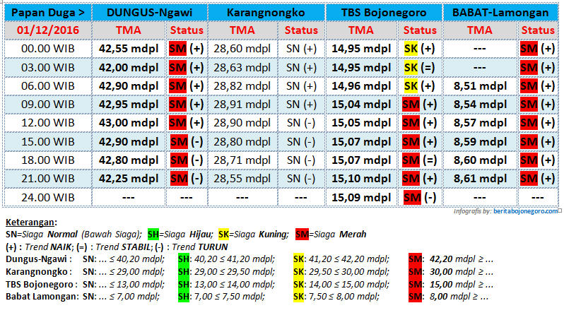 Berikut ini update status Tinggi Muka Air (TMA) Bengawan Solo, yang diterima BeritaBojonegoro.com dari UPT Pengelola Sumber Daya Air (UPT PSDA) Wilayah Sungai Bengawan Solo untuk tanggal 01 Desember 2016, hingga pukul 24.00 WIB. (*/inc)