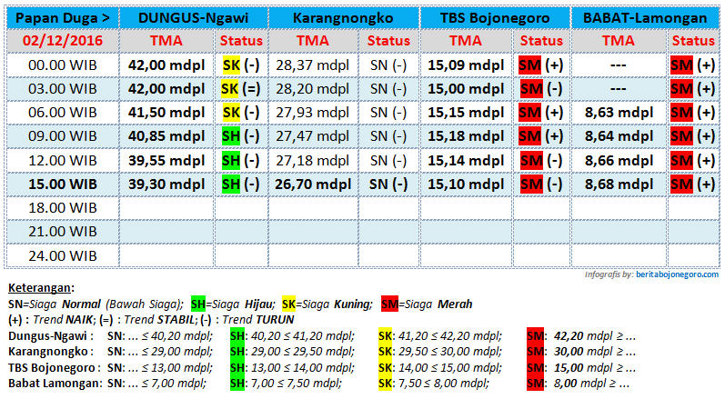 Sementara elevasi Tinggi Muka Air (TMA) Bengawan Solo pada padan duga Taman Bengawan Solo (TBS) Bojonegoro Kota pada Jumat (02/12/2016) pukul 15.00 WIB, mulai menunjukkan trend turun namun masih dalam status siaga merah. Penurunan tersebut seiring yang terjadi pada papan duga Karangnongko Ngraho dan Dungus Ngawi. Namun untuk wilayah timur Kabupaten Bojonegoro, pada papan duga Babat Lamongan, masih menunjukkan trend naik.