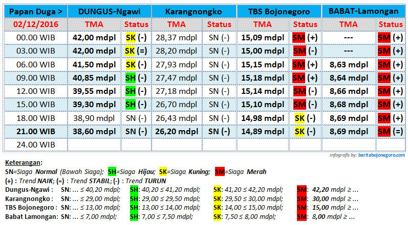 Berikut ini update status Tinggi Muka Air (TMA) Bengawan Solo, yang diterima BeritaBojonegoro.com dari UPT Pengelola Sumber Daya Air (UPT PSDA) Wilayah Sungai Bengawan Solo untuk tanggal 02 Desember 2016, hingga pukul 21.00 WIB. (*/inc)