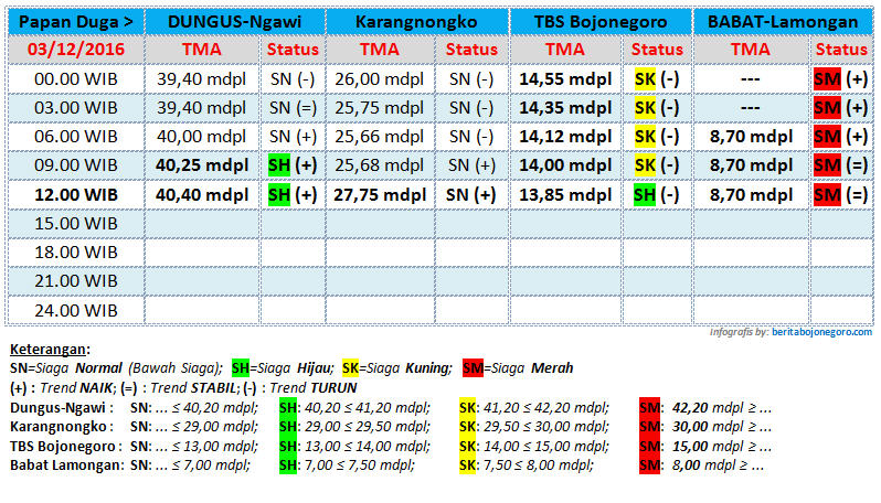Berikut ini update status Tinggi Muka Air (TMA) Bengawan Solo, yang diterima BeritaBojonegoro.com dari UPT Pengelola Sumber Daya Air (UPT PSDA) Wilayah Sungai Bengawan Solo untuk tanggal 03 Desember 2016, hingga pukul 12.00 WIB. (*/inc)