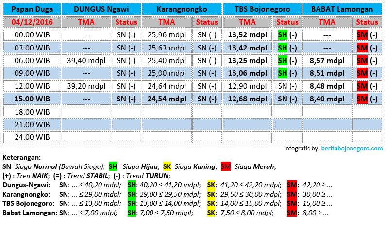 Sebagaimana diketahui, sejak Kamis (01/12/2016) pukul 08.00 WIB lalu, elevasi Tinggi Muka Air (TMA) Bengawan Solo pada papan duga Taman Bengawan Solo (TBS) Bojonegoro Kota dinyatakan masuk dalam status siaga merah, selanjutnya pada Jumat (02/12/2016) pukul 18.00 WIB, statusnya turun menjadi siaga kuning. Dan pada Sabtu (03/12/2016) pukul 12.00 WIB kemarin, statusnya turun lagi menjadi siaga hijau.